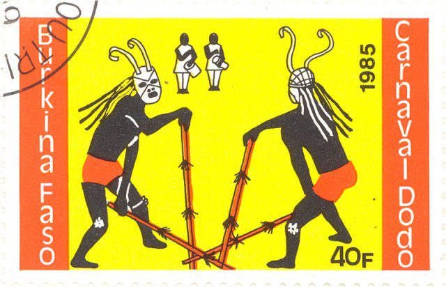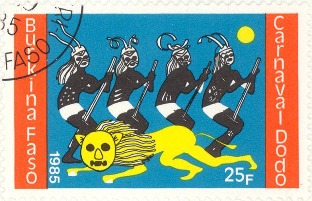 Masked stick dancers and drummers. Dodo Carnival.